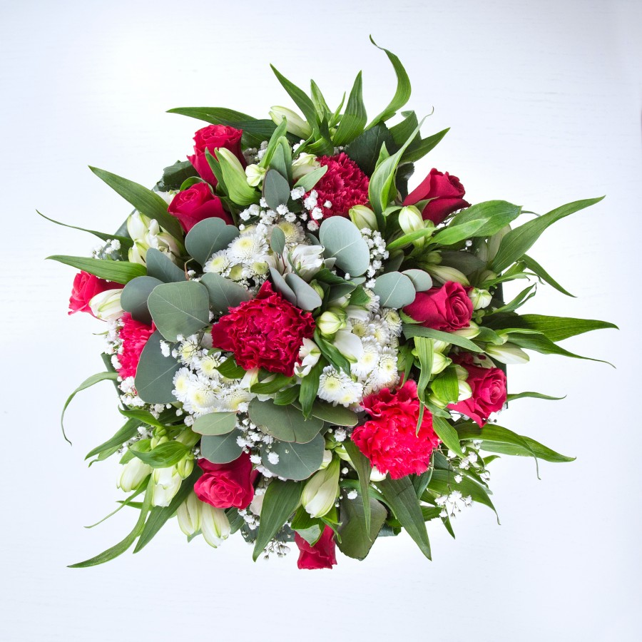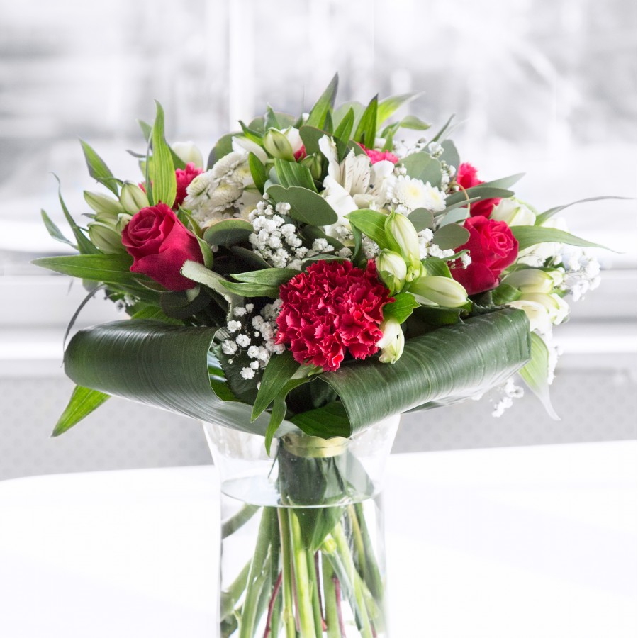 Discover the opulent charm of our Opulent Charm Bouquet. This luxurious arrangement features sweet white chrysanthemums and gypsophila, combined with rich red roses and vibrant carnations, elegantly arranged with white alstroemeria and aspidistra leaves.